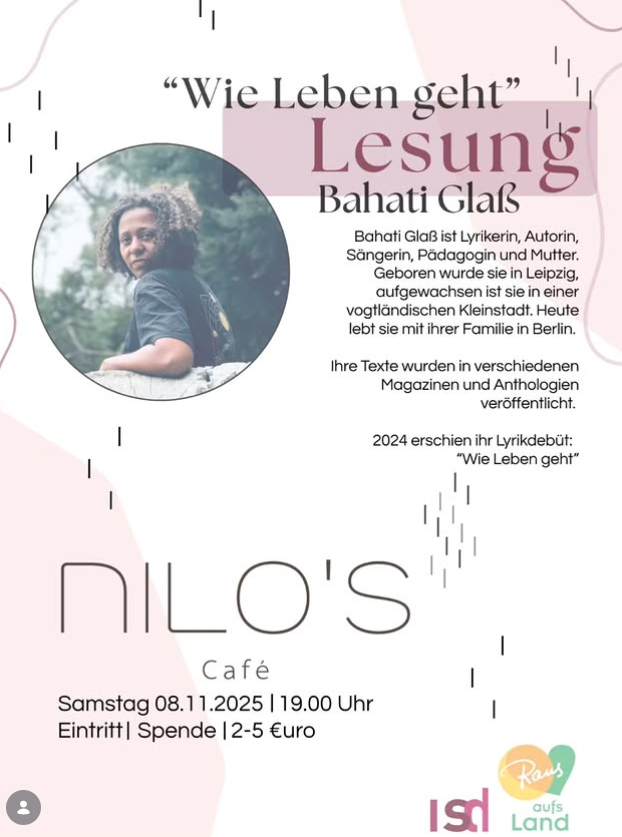 Bahati Glaß ist Lyrikerin, Autorin, Sängerin, Pädagogin und Mutter. Geboren wurde sie in Leipzig, aufgewachsen ist